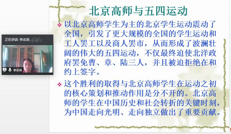 2020年5月28日上午,【华体会网】中国古代史教师党支部与2018级硕士生党支部开展支部共建举办主题党日活动,邀请历史学院李志英教授为各位师生党员作题为《北京师范大学是五四运动的策源地之一》的专题讲座。受新冠肺炎疫情影响,讲座采用腾讯会议平台进行,师生党员共计60余人在线聆听了此次精彩讲座。讲座由中国古代史教师党支部书记陈涛主持。
