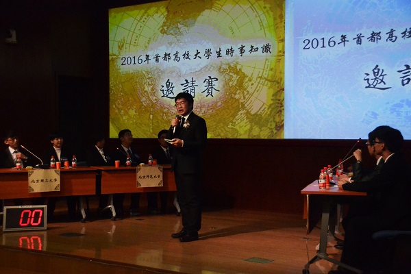 当天下午,2016年首都高校大学生时事知识邀请赛总决赛在我校京师学堂京师厅举行。北京高校形势与政策教育研究会副理事长教育部高校辅导员培训和研修基地(北京师范大学)执行副主任王显芳老师,北京高校形势与政策教育研究会副理事长、北方工业大学马克思主义学院形势与政策教研室主任王包泉老师,北京科技大学学生工作部部长于成文老师,北京交通大学学生处副处长王皓老师,中央民族大学形势与政策研究室主任李泓老师,河南师范大学历史学院分党委书记王霞老师,我院分党委副书记王卓凯老师作为嘉宾出席本次活动。此外,出席今天活动的还有来自国际关系学院、北京航空航天大学、北京理工大学等参赛高校的学生代表和亲友团成员。
