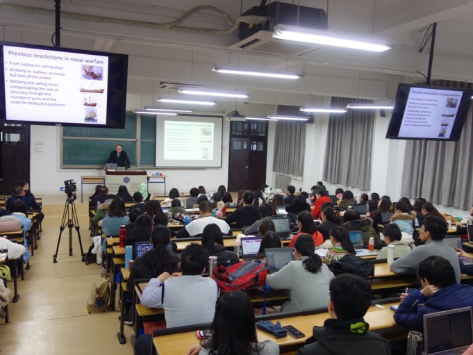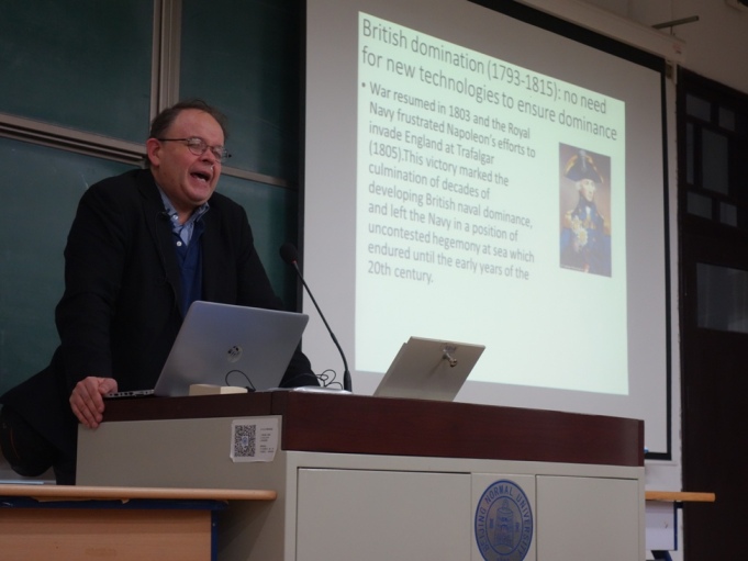 2017年12月11日-14日,应【华体会网】邀请,法国国家海军史研究中心首席专家、知名学者亚历山大•谢尔东-杜普莱教授(Alexandre Sheldon- Duplaix)前来北京师范大学讲学。12月12日上午,杜普莱教授走进“世界近代史”课堂,为【华体会网】2015级本科生作了题为“工业革命与世界海权(1789-1918)”的学术讲座。本次讲座系我校励耘学术讲堂历史学系列讲座之一,由历史学院世界近代史教研室江天岳博士主持,历史学院世界近代史教研室贾珺副教授等出席了讲座。前来聆听的还有来自北京师范大学和其他首都高校的学生和军事史爱好者。