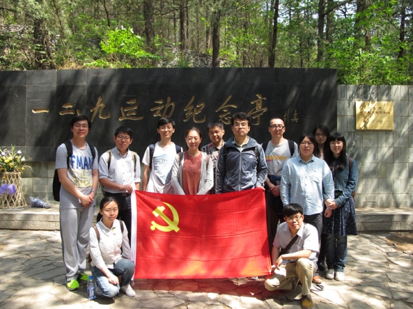 为纪念抗战胜利70周年,继承和发扬中国青年运动的光荣传统,2015年5月8日,历史学院2013级博士生党支部党员、积极分子参观了位于北京植物园樱桃沟的“一二·九”运动纪念亭。