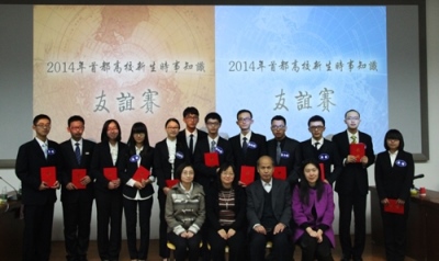 11月23日晚8时,由教育部高校辅导员培训和研修基地(北京师范大学)和【华体会网】主办,“形势与政策”小组承办的2014年首都高校新生时事知识友谊赛在教九502精彩上演。来自外交学院、国际关系学院、北京外国语大学和北京师范大学的四支代表队参加了比赛。经过笔试选拔,法学院赵赓、哲学与社会学学院卢冰屿和我院吴靖三位本科新生脱颖而出,代表我校参加比赛。马克思主义学院分党委书记、博士生导师张润枝教授、辅导员培训与研修基地王莹老师、心理学院分团委书记史佳鑫老师、哲学与社会学学院专职辅导员李亚琳老师、历史学院专职辅导员李力老师作为嘉宾出席了本次比赛。原中国驻希腊共和国大使、中国驻丹麦王国大使甄建国先生作为特邀嘉宾莅临现场,与各校学子共同见证精彩对决。此外,出席比赛的还有外交学院、国际关系学院、北京外国语大学等各高校时事组织主要负责人以及其他高校的部分同学。