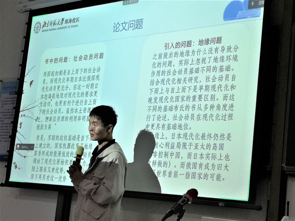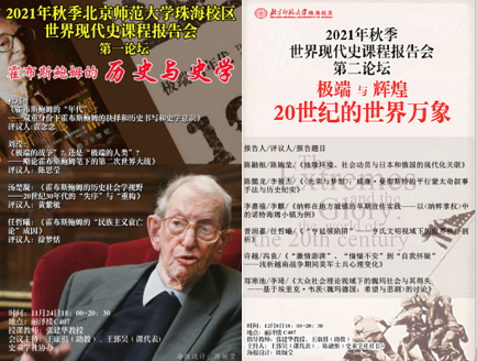 2019级历史专业被称为北京师范大学珠海校区的“黄埔一期”,而本学期的“世界现代史”课程是世界通史的最后阶段,亦是必修课程,授课教师是历史学院的张建华教授。为了检验同学们的专业阅读能力、专业写作能力、专业理论能力和专业翻译能力,张老师要求71位同学们将阅读世界现代史名著并完成读书报告作为期中作业。张老师在助教王康祺的协助下,认真了阅读每位同学的读书报告,在题目、结构、理论、翻译和文字等方面提出详细修改意见,目的是提升每一篇读书报告的学术水平,使其成为更加专业的学术史论文。最终从多次修改并定稿的71篇学术史论文中选择了最具代表性的10篇论文,先后在“世界现代史”课程上设置两个论坛,论坛主题分别为“霍布斯鲍姆的历史与史学”(2021年11月24日)和“极端与辉煌:20世纪的世界万象”(2021年12月8日),在丽泽楼C407举办了世界现代史课程读书报告会。