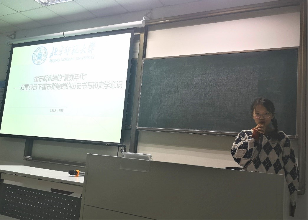 汤楚凝则从20世纪30年代这个时期入手,探究霍布斯鲍姆特殊的历史研究方法——历史社会学,并从中进一步探索霍布斯鲍姆糅合了历史学和社会学的研究特点。她的论文题目是《霍布斯鲍姆的历史社会学视野:20世纪30年代的“失序”与“重构”》。她向同学分享了她阅读相关书目后的几点启发:第一,历史看似杂乱无章,其实是有主线的,每个时代都有自身的主题;第二,在坚持叙述真实的前提之下,历史学家的立场极具价值;第三,书写出体系完备的通史巨著,对于历史学家而言是一个很高的要求。同时,她还向同学们分享了自己写作后的心得体会:第一,视野不再应该局限于一本书、一篇文章,而是同作者的多本书、同时期针对同一问题的著述,甚至是不同时期针对同一问题的著述。第二,应以一定的逻辑或理论将全文串联起来。