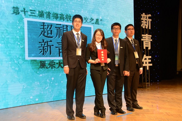 2017年5月12日晚,第十三届“超视野·新青年”首都高校外交之星风采大赛在北京外国语大学千人礼堂落下帷幕。由我院2014级本科生张慧、2016级本科生张家昌,以及我校教育学部2013级本科生高鑫、地理科学学部2013级本科生刘晨组成的北京师范大学代表队受邀参赛,获得优胜奖。本次比赛共有来自中国人民大学、北京师范大学、北京外国语大学、国际关系学院、对外经济贸易大学、外交学院等高校的七支代表队参加比赛。我院“形势与政策”小组承担了比赛的校内选拔和选手培训工作。