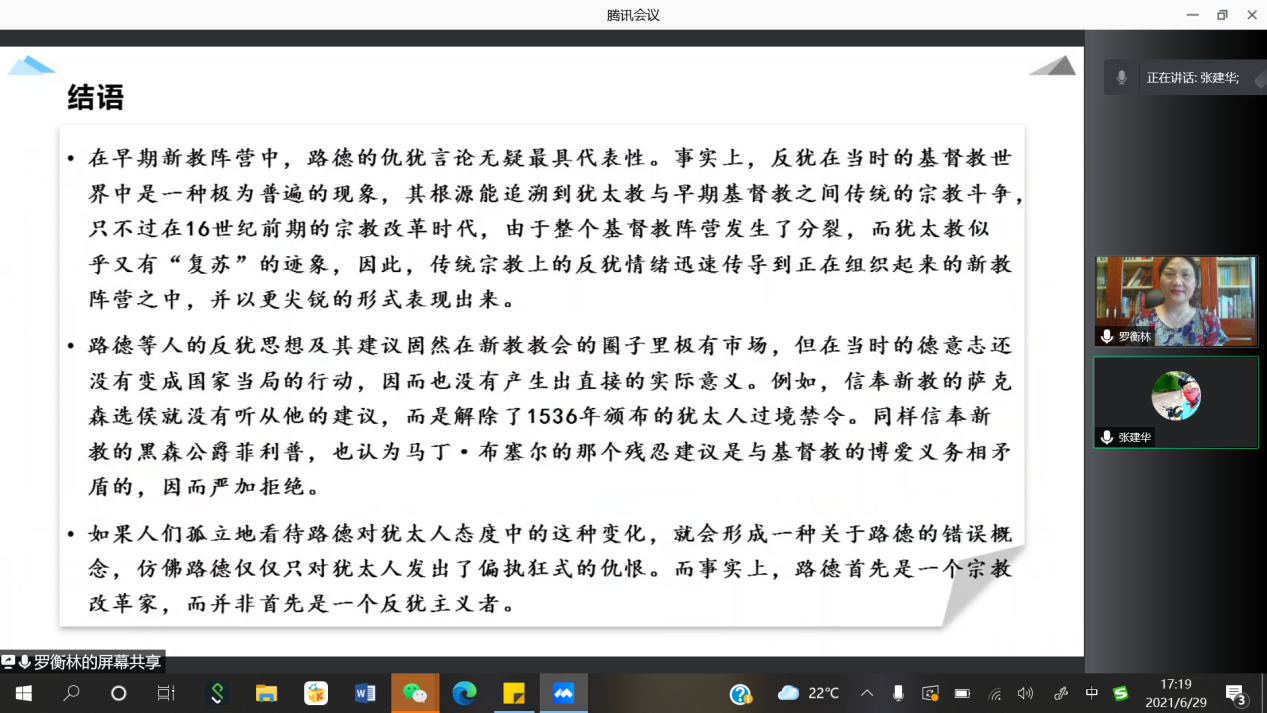 2021年6月29日下午,湖南师范大学历史文化学院的罗衡林教授通过腾讯会议为我院师生及线上观众做了一场精彩的线上讲座“巨人之暗:马丁·路德对犹太人的态度及立场分析”。本场讲座系“京师史学名家前沿系列讲座”,也是【华体会网】暑期小学期系列讲座的内容。讲座由我院张建华教授主持。