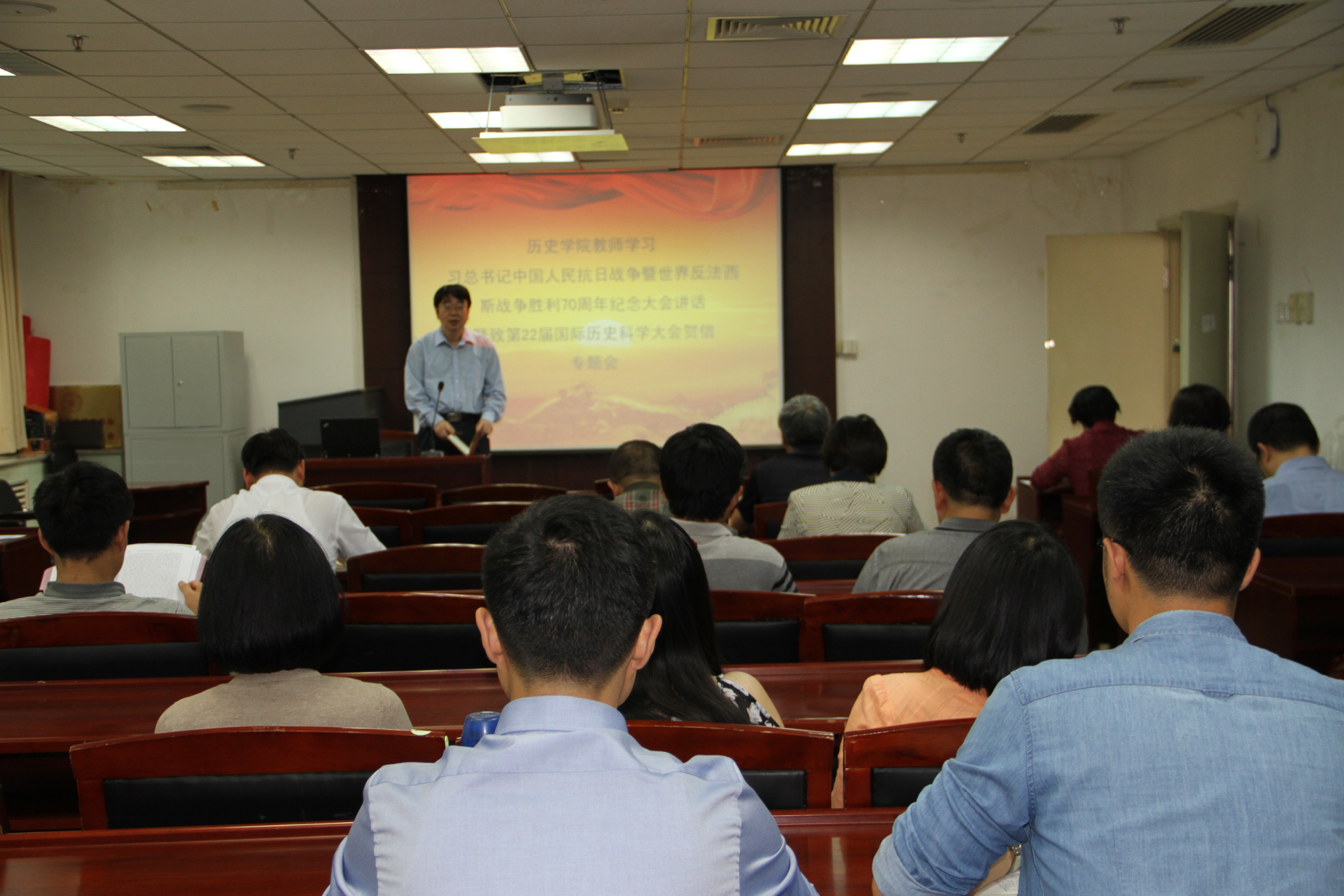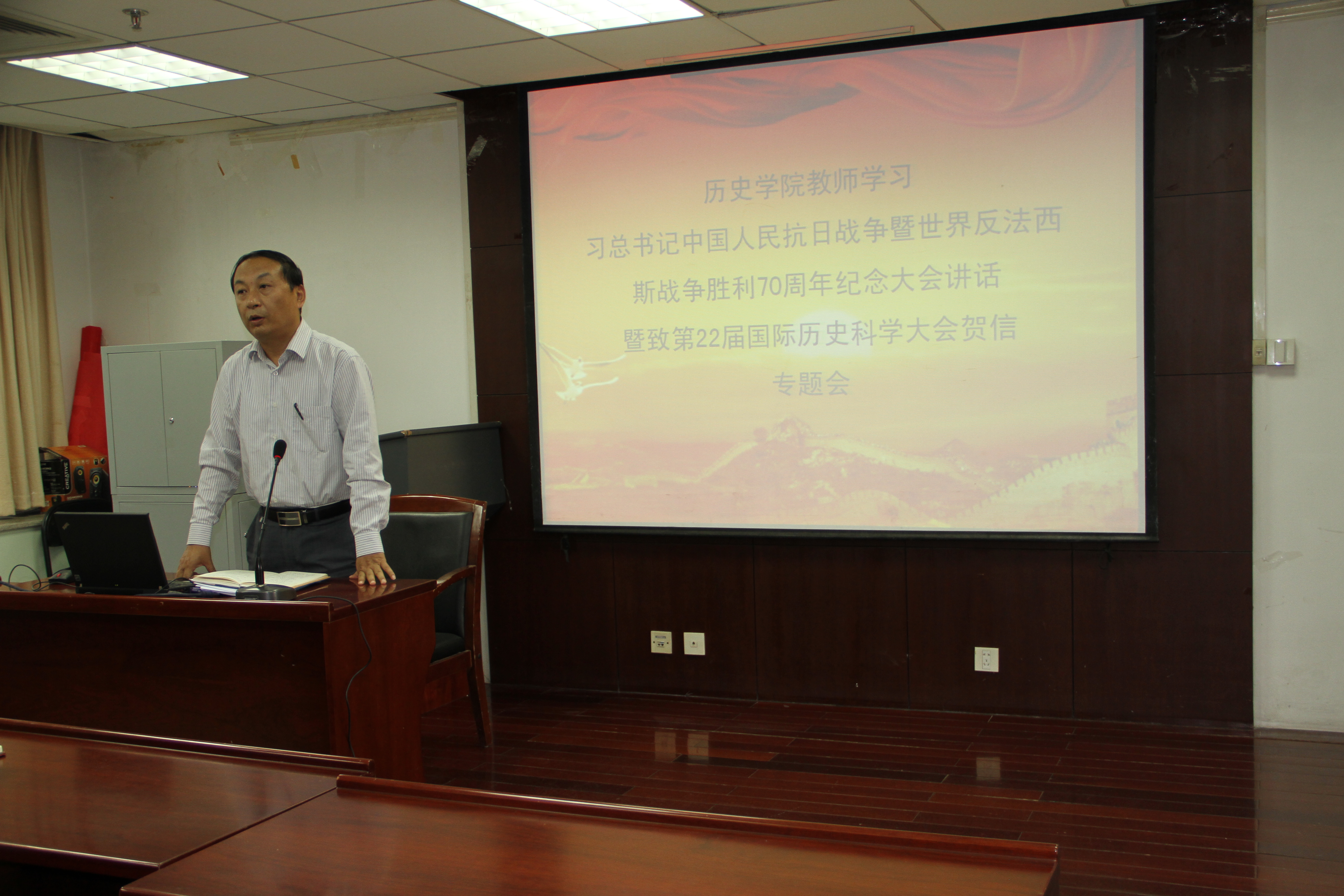 9月16日下午,我院召开新学期全院教师大会,集体学习了习近平总书记在纪念中国人民抗日战争暨世界反法西斯战争胜利70周年纪念大会上的讲话,以及习近平主席致第22届国际历史科学大会的贺信。大会由院长杨共乐主持。