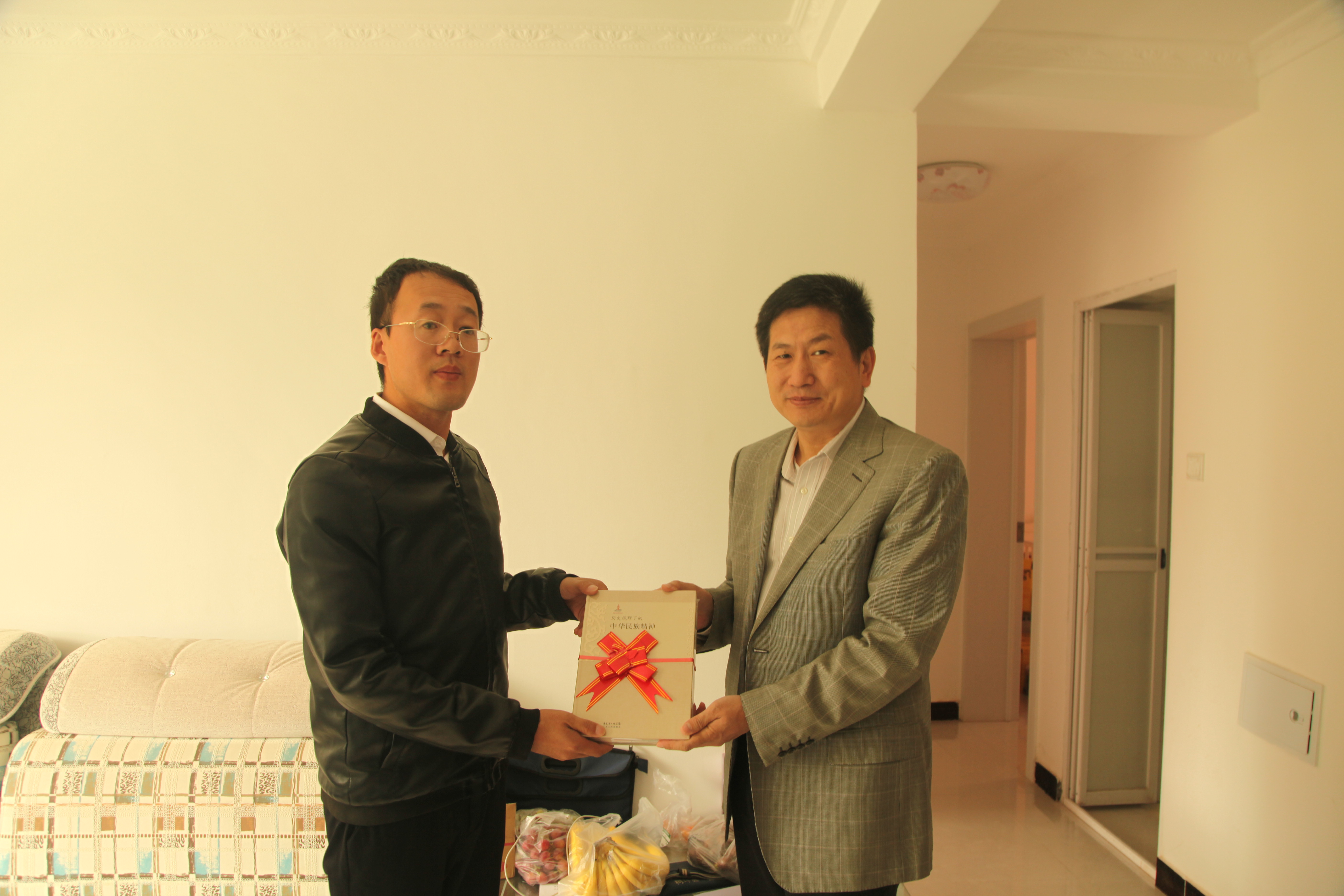 郭家宏书记一行首先来到郭平家中走访,转达了历史学院对郭平夫妻的慰问,对郭平在柯坪县的生活、工作情况进行了详细询问,并对郭平夫妻扎根新疆、服务基层的行为表示钦佩。郭家宏书记高度评价了郭平同学“到祖国最需要的地方”建功立业的事迹,称赞他是青年勇挑重担、不负使命的优秀代表,鼓励他发扬“学为人师、行为世范”的校训精神和“敬业谨严、同心奋进”的院训精神,立足基层,踏实工作。郭家宏书记代表历史学院向郭平赠送了郑师渠教授主编的《历史视野下的中华民族精神》一书,鼓励郭平在工作之余继续专业学习,强调历史学院永远是每一个师大历史人的精神家园,学院始终关注着每一位校友。欢迎郭平常回母校、常回学院,常回家看看。郭平非常感谢学院的慰问,表示将继续努力工作,不负学院的培养。