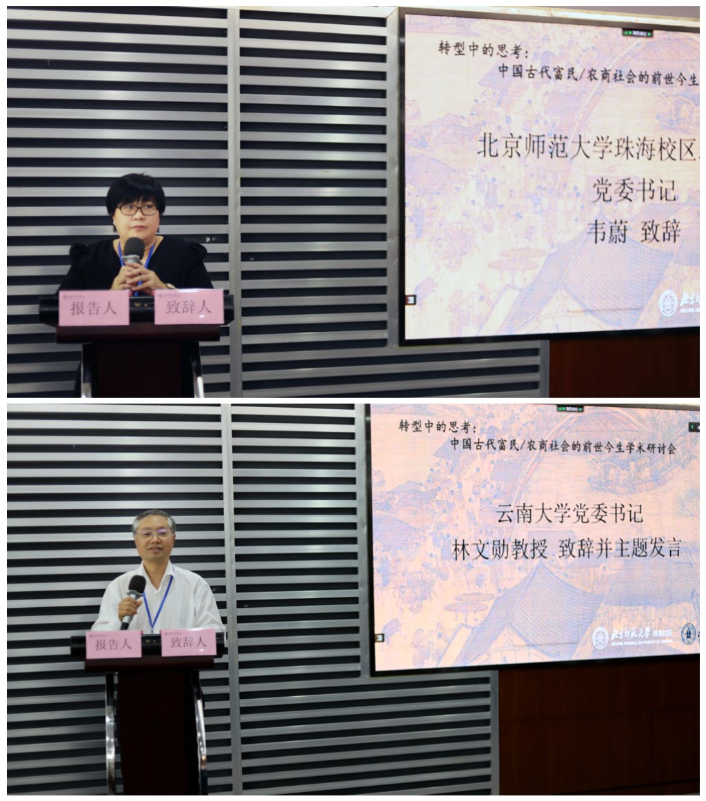 北京师范大学珠海校区党委书记韦蔚老师出席开幕式并致辞,对与会专家学者表示了热烈欢迎,并介绍了北京师范大学珠海校区建设的背景与前景。云南大学党委书记林文勋教授致辞并作主题发言。他明确指出本次会议的重要学术价值在于总结中国传统社会的来源与过往,共同为富民社会、农商社会的深入研究进一步明确学术方向与学术思路。