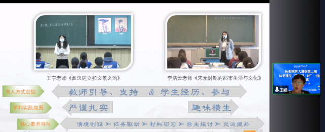 北京市教育科学研究院历史教研员王耘老师首先和大家分享了参加新义务教育课程标准国家级示范培训的体会,然后从育人方式定位、学科实践氛围、核心素养导向、学生成长外显四个方面,肯定了王宁老师和李洁云老师的课堂教学设计,同时从学法指导与实质性评价反馈、教师的思维指导等方面给两位老师提出切实可行的建议。