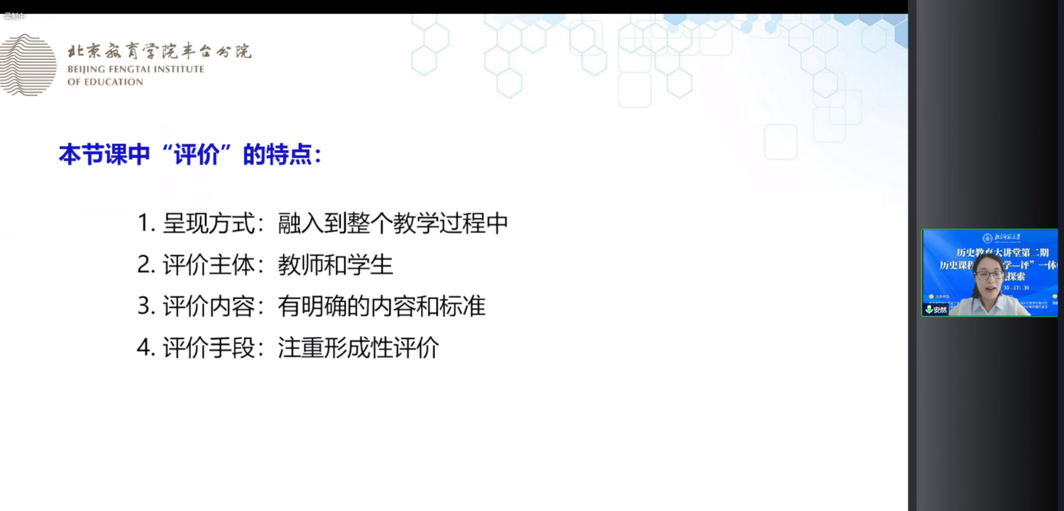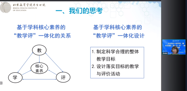 北京教育学院丰台分院历史教研员吴波老师以《以评促学——北京市丰台区历史学科教学评一体化的实践与反思》为题做主题讲座,介绍了近两年北京市丰台区历史教师在历史学科教学评一体化方面的实践探索,总结了在探索过程中的收获和反思,从重视评价的整体性规划、教学过程需要详略得当、围绕重点活动开展评价、依据具体学情开展评价、精细设计活动评价标准、强化学生的形成性反思、加强教师的针对性指导七个方面提出了改进设想。