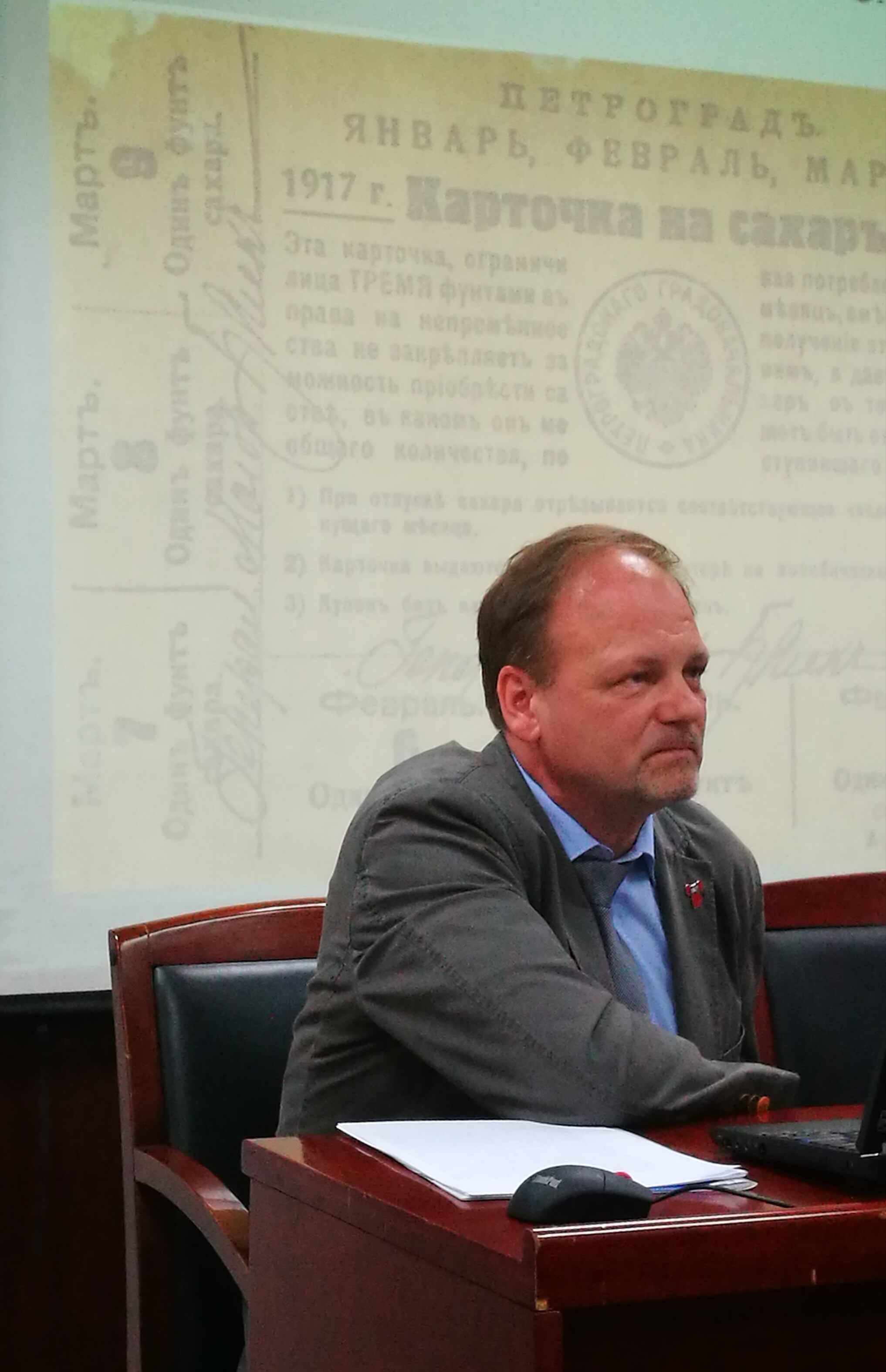 霍佳科夫教授(Михаил Викторович Худяков),现为俄罗斯彼得堡国立大学历史学院教授,俄国现代史研究室主任,俄罗斯国立政治历史博物馆学术委员会委员会,圣彼得堡市议院学术与高教委员会会员,圣彼得堡国家档案委员会委员,《俄罗斯现代史》杂志主编。讲座从档案文献和学术史的角度,为听众讲述了引发俄国变革和世界震荡的1917年俄国大革命,同时介绍了苏联时期和当今俄罗斯学者对大革命的态度及历史反思。霍佳科夫教授认为,1917-1922年是俄国历史上非常重要的阶段,它以1917年革命为标志性事件,与其之前1914年爆发的第一次世界大战和之后发生的国内战争有着不可割裂的联系。
